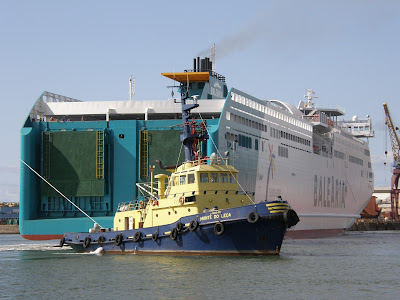 | Abel Matutes being pulled from drydock (with propellers still not running) by tugboat Monte do Leça. |